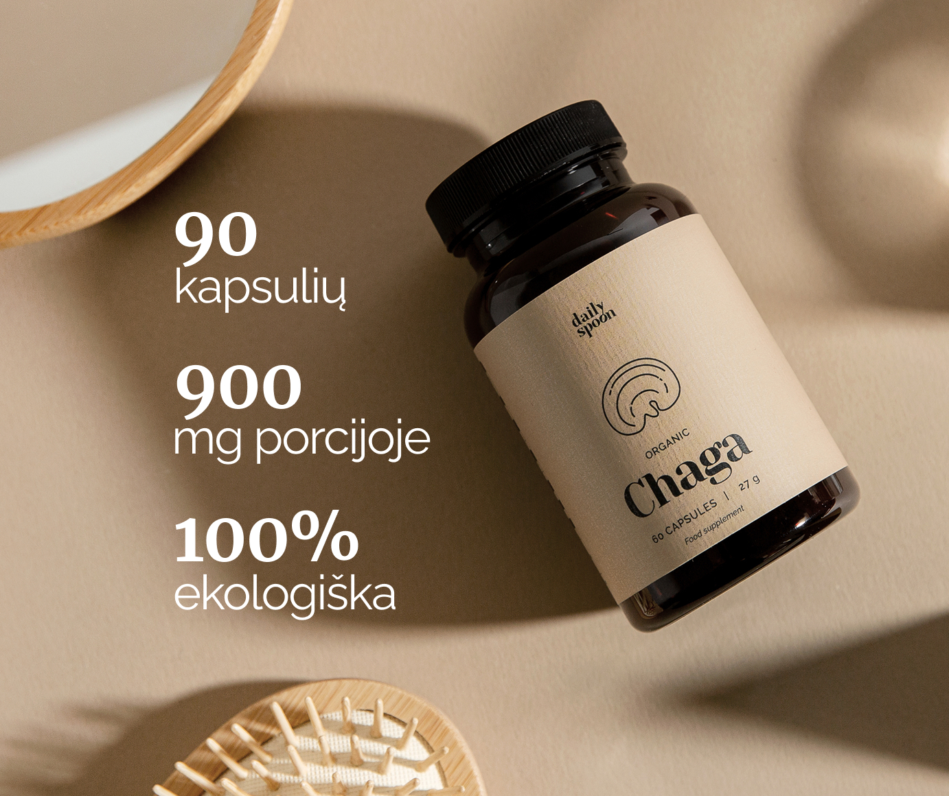 Sužinoti daugiauOrganic chaga (Inonotus obliquus) powder, organic sunflower oil, hypromellose (vegan capsule shell).