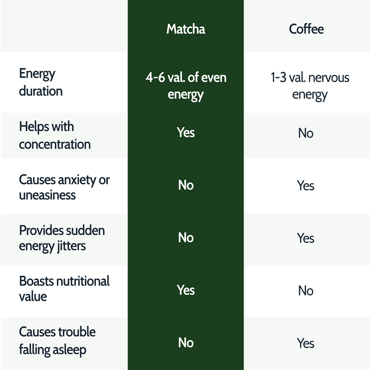 Instead of the quick caffeine spike followed by an energy crash, like with coffee, the energy from matcha is released more slowly and steadily. This is why matcha provides a sense of calm alertness. Additionally, caffeine and L-theanine working together can help improve focus for tasks that require cognitive effort.