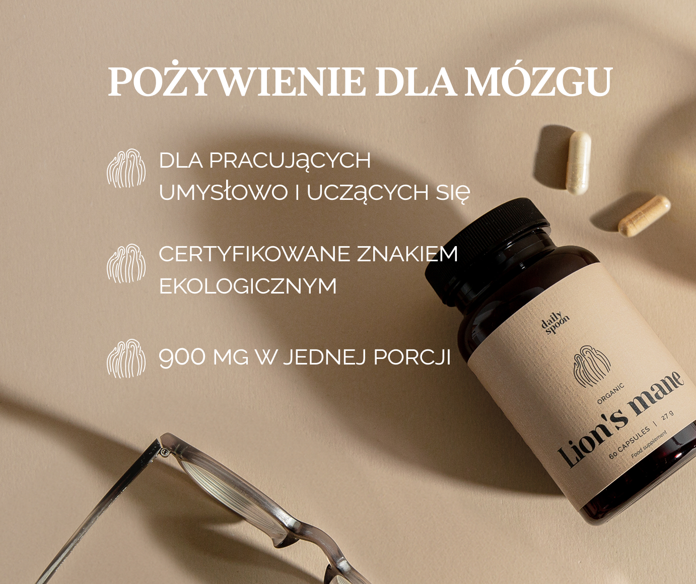 Proszek z ekologicznego grzyba Hericium erinaceus (Lion’s mane / Lwia grzywa), hipromeloza (wegańska otoczka kapsułki).
